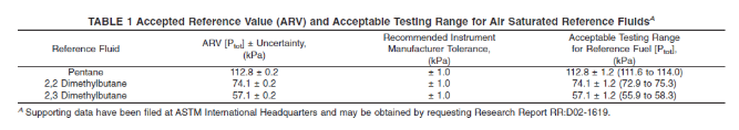 Table 1 provides the accepted reference value (ARV) [Ptot] and uncertainty limits (at least 95 % confidence interval) of reference fluids tested in the 2003 D5191 ILS. As stated before, the “Ptot” reference used in Test Method D5191 (and Table 1 of this test method) is equivalent to VPCR4 (37.8 °C) in this test method. This information, combined with the tolerance value recommended by instrument manufacturers, was used to establish the acceptable testing range for the reference fuels to verify instrument performance.