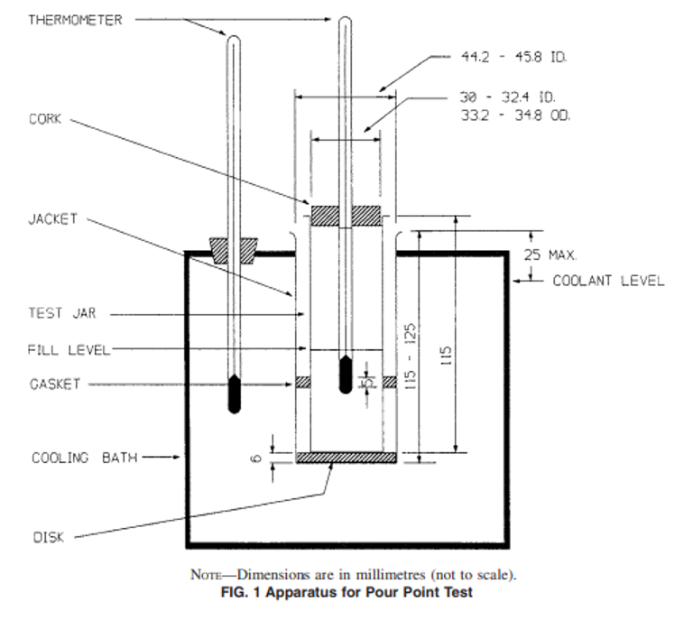 After preliminary heating, the sample is cooled at a specified rate and examined at intervals of 3°C for flow characteristics. The lowest temperature at which movement of the specimen is observed is recorded as the pour point.
